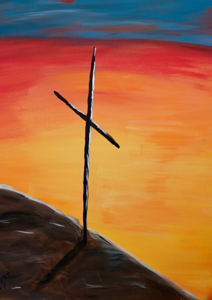 I was passing through a hospital this week on my way to a meeting when I spotted the above painting, artist unknown. I was struck by the color and contrast, by the sloping downward diagonal upon which the cross is shown. By the shadows. By the blue arc above the sunset sky. By the narrow beams of wood, barren of any victim.