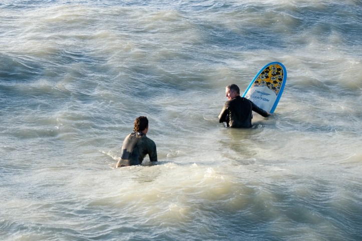 I saw two men waiting. For long spells. They watched the waves approach and worked to position themselves to that exact spot where they believed the proper crest would allow for success. Far more often than not, they were wrong. They arrived slightly too early or too late or were positioned just a bit too far one way or the other. In some rare instances, they hit it just right and then had to work to stay on their boards. Often, they crashed, were swept up into bubbling foam and cursing spray.