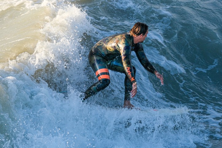 But recently, I had an opportunity to walk the length of the Naples (Florida) Pier and there were a few surfers there celebrating the incoming waves. The pier offered a unique top-down perspective on their efforts and so I tried to capture their successful attempts at riding in on one of them. It was interesting. It was surprising.