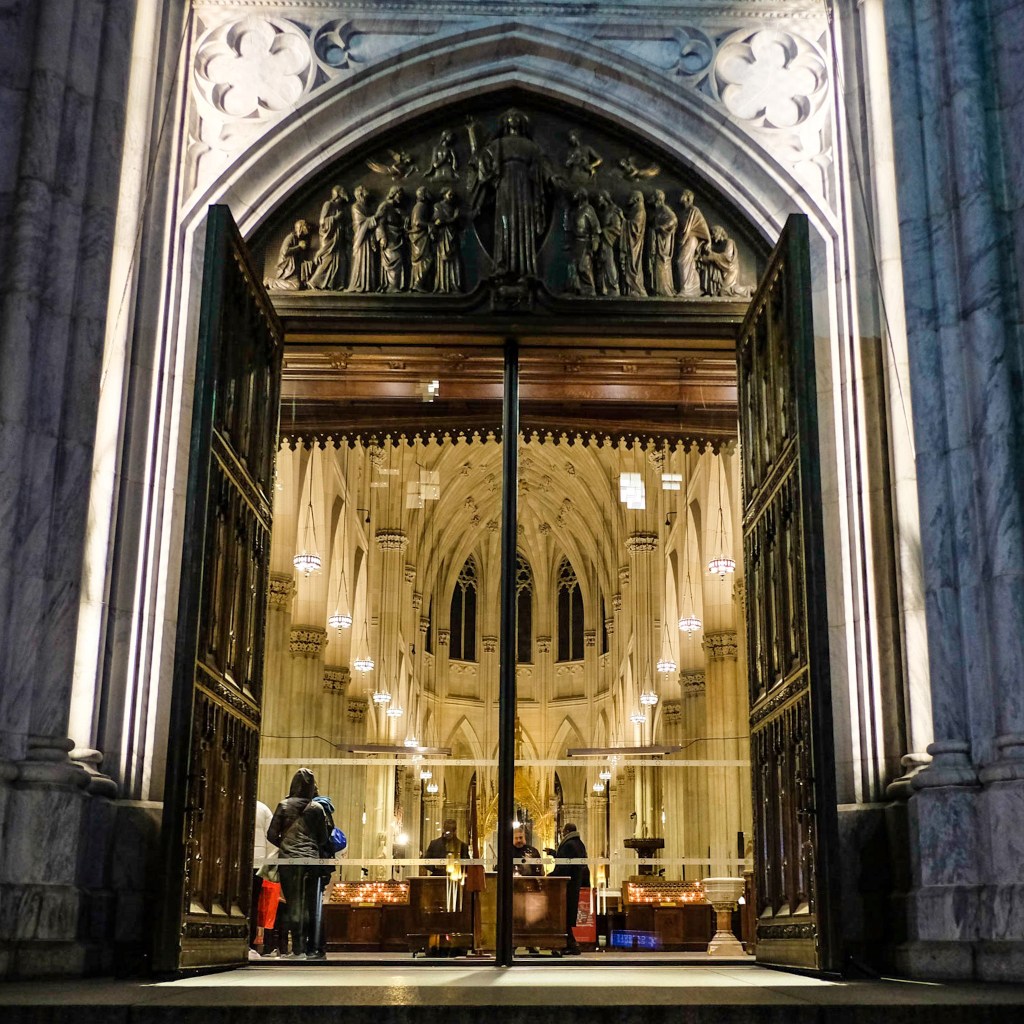 Finally, the massive wooden front doors were decidedly ajar and a large, glass set of doors stood in their place. This allows a view of the church and altar from the outside, from 5th Avenue, from New York’s hustle and bustle. This struck me as a particularly worthwhile modification.
