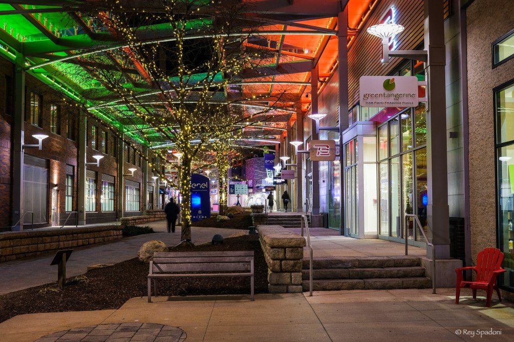 I visited an outdoor mall tonight and had about 90 minutes to drain while I waited for someone at a nearby appointment. Because I had my Fujifilm X100V with me, which is what I tend to do these days, I thought I’d take a walk through the typically (very) hopping place. I’ve not been there since covid’s attack and so was struck by the solitude. Many stores are shuttered up, gone. Many closed due to shorter than normal hours. A few were open. Occasionally, I saw a couple of people stroll by. It was quiet. It was quaint. It was sad.