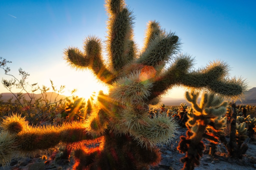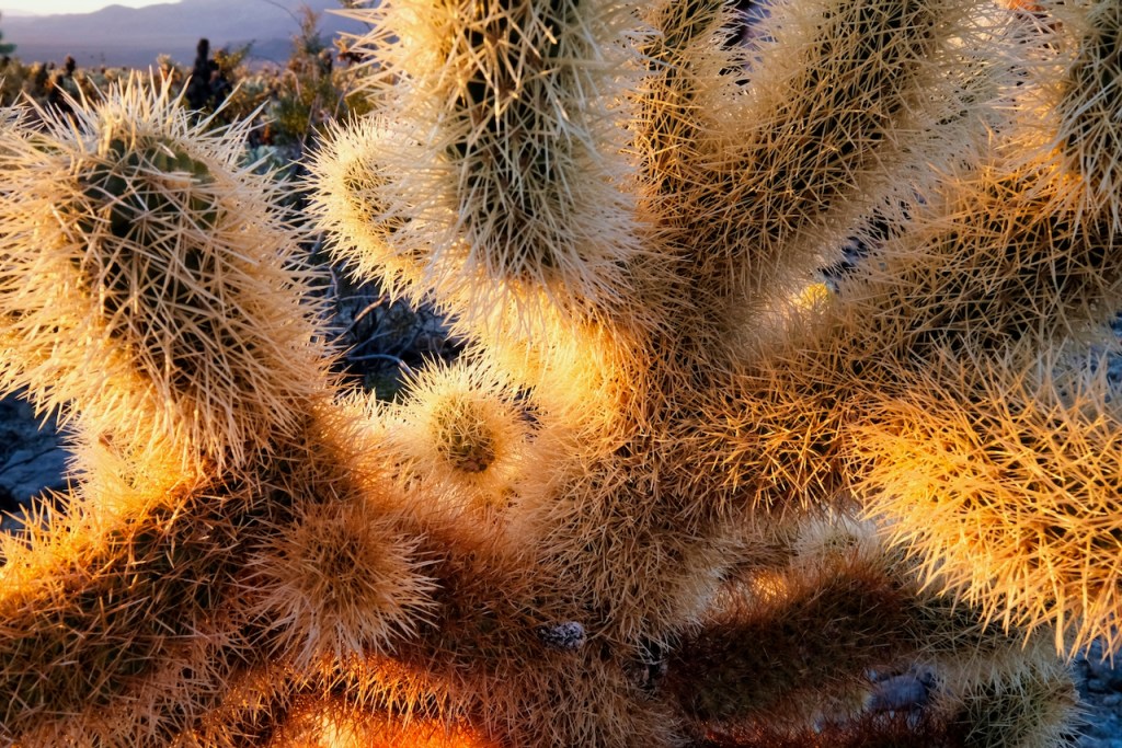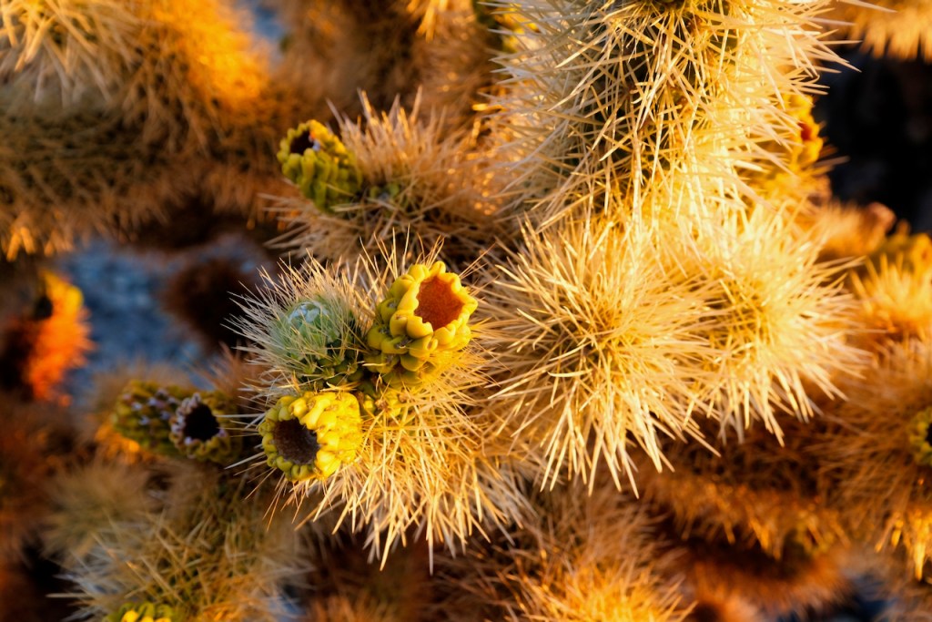 About twelve miles from the nearest entrance to where I was staying is the Cholla (pronounced choy-ah) Cactus Garden. It’s a landmark site in Joshua Tree National Park, placed right alongside a fairly main thoroughfare. A flat and occasionally boardwalk-ed loop trail leads you through a garden area that is best seen at sunrise. Because this is very popular at that hour, you are encouraged to get there quite early to get a parking spot. I arrived well in advance of the actual sunrise and even though I was not there during peak season, I failed to get a spot. So, I left the rental car precariously and probably annoyingly along the road’s shoulder.