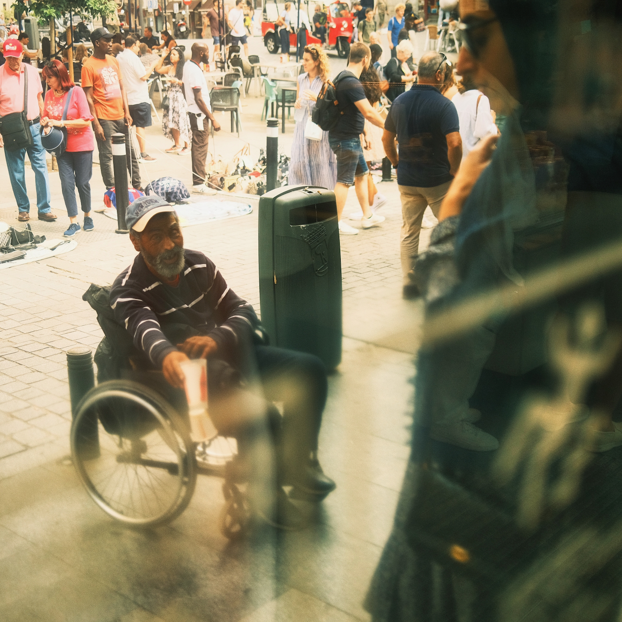 Man. Homeless in fact. Encircled in a tight den of his only possessions.