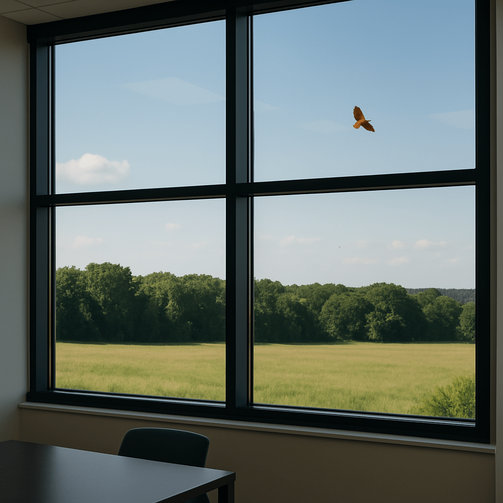 Meanwhile, Ellis watched a red tailed hawk hovering across the newly budded tree tops, noticed the cloud cover shadows, and observed signs of a breeze caressing the hedgerows before him. He considered the contrast, something he had done before, of the busy sounds of life inside the net competing with the silent comfort of the setting just outside of his window. The window always was his boundary, his high wall. His release.